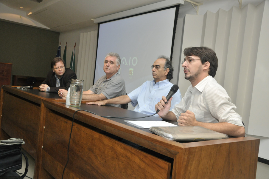 Da esquerda para a direita: Andrey Rosenthal Schlee do IPHAN, Raimundo Martins, diretor da FAV, José Artur D´Alo Frota, professor da FAV, e Camilo Vladmir de Lima Amaral, coordenador do curso de Arquitetura e Urbanismo