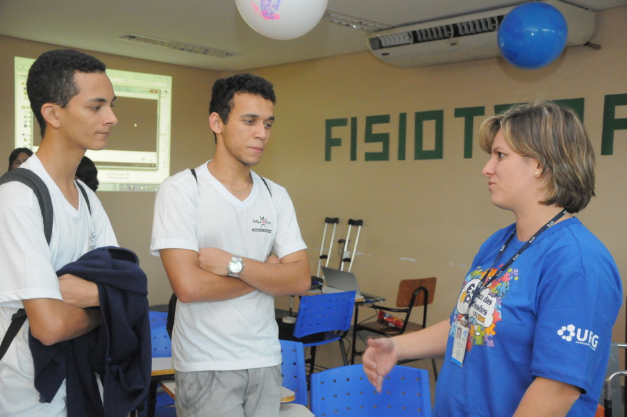 Quatro alunos do curso vieram para auxiliar os professores a organizar a apresentação no evento, além de compartilhar suas experiências com os visitantes. A estudante Beatriz Regina Fernandes Rodrigues, que entrou na primeira turma da graduação, relatou que existem muitas dúvidas sobre a área de atuação do fisioterapeuta. “Vários adolescentes perguntam sobre a área de trabalho, pois acham que ela se resume à reabilitação, mas a profissão abrange várias outras atuações”, esclareceu ela.