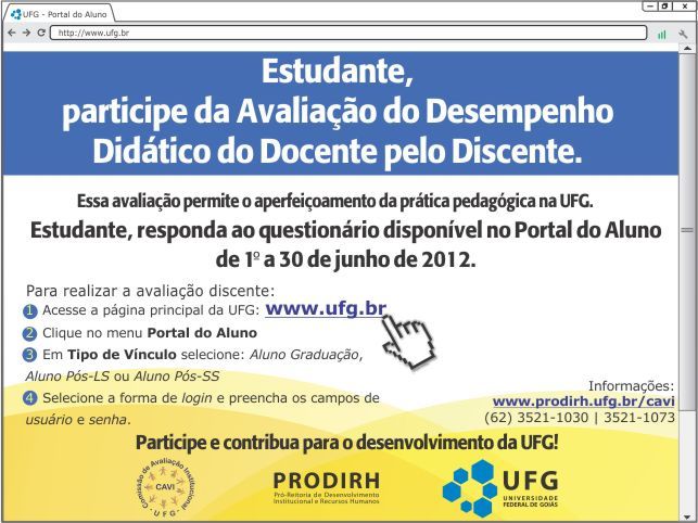 Avaliação de desempenho didático do docente pelo discente começa no dia 1º de junho Em 29/05/12 00:18. A avaliação é realizada pelo Portal do Aluno. Professores podem acompanhar o processo pelo Portal do Servidor Fonte: Prograd/UFG TweetWhatsApp Listar Todas Voltar