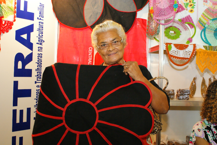 Por falar em colorido, o estande da Federação Nacional dos Trabalhadores e Trabalhadoras na Agricultura Familiar (FETRAF – GO) estava carregado de tapeçarias e doces, ambos ricos em cores e formatos. Mocinha branca, rapadura, gergelim, mandioca, tapetes, capas de almofada, bordados, trançados, colchas de retalhos: difícil nomear os múltiplos elementos que compunham a visualidade. Quem falou em nome do estande foi Joana Darc Alves Pereira Gomes, coordenadora das mulheres do FETRAF goiano. De acordo com ela, na feira há dez expositores, sendo a maioria formada por mulheres. Eles vieram de assentamentos de diversos municípios, entre eles, Fazenda Nova, Caiapônia, Jataí, Piranhas e Palestina. Maria Gouveia da Silva é uma destas mulheres. Moradora do assentamento Bom Prazer, em Fazenda Nova, ela veio à feira para expor seus tapetes, capas e sabões caseiros. Para ela, a parte mais importante da participação no evento é o estabelecimento de novos contatos e a troca de experiências. No próximo sábado, dia 16, os dez membros da FETRAF seguem para o Rio de Janeiro, onde irão integrar a Cúpula dos Povos na Rio +20.