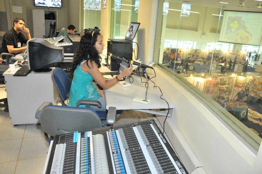Liliane Bueno, monitora da Rádio Universitária 870AM, faz locução para a rádio interna da Agro Centro-Oeste Familiar