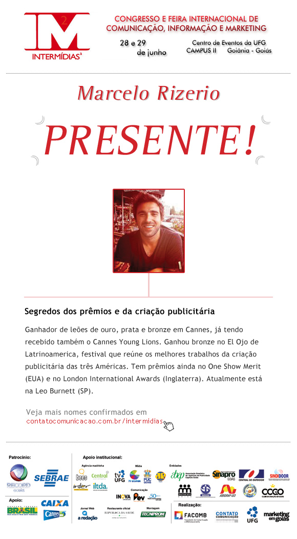 O 2º Intermídias vai trazer a Goiás em 2012 o publicitário Marcelo Rizério, ganhador de leões de ouro, prata e bronze em Cannes, já tendo recebido também o Cannes Young Lions. Atualmente está na Leo Burnett (São Paulo). No Intermídias, Rizério vai falar sobre o segredo dos prêmios e da criação publicitária. A palestra ocorre das 15h30 às 17h.