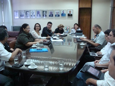 Acompanhados pelo reitor da UFG, Edward Madureira Brasil, a pró-reitora de Graduação, Sandramara Matias Chaves, o pró-reitor de Desenvolvimento Institucional Jeblin Abraão, representantes da Prograd e do Centro de Recursos Cmputacionais (Cercomp) foram recebidos esta manhã pela reitora da Universidade Federal do Rio Grande do Norte, Ângela Maria Paiva, que estava acompanhada de alguns pró-reitores e representantes da equipe de Tecnologia da Informação. A visita da UFG à UFRN tem o objetivo conhecer o funcionamento do Sistema Integrado de Gestão de Atividades Acadêmicas (SIGAA) da instituição para investigar a possibilidade de implementar mudanças no sistema utilizado pela UFG.