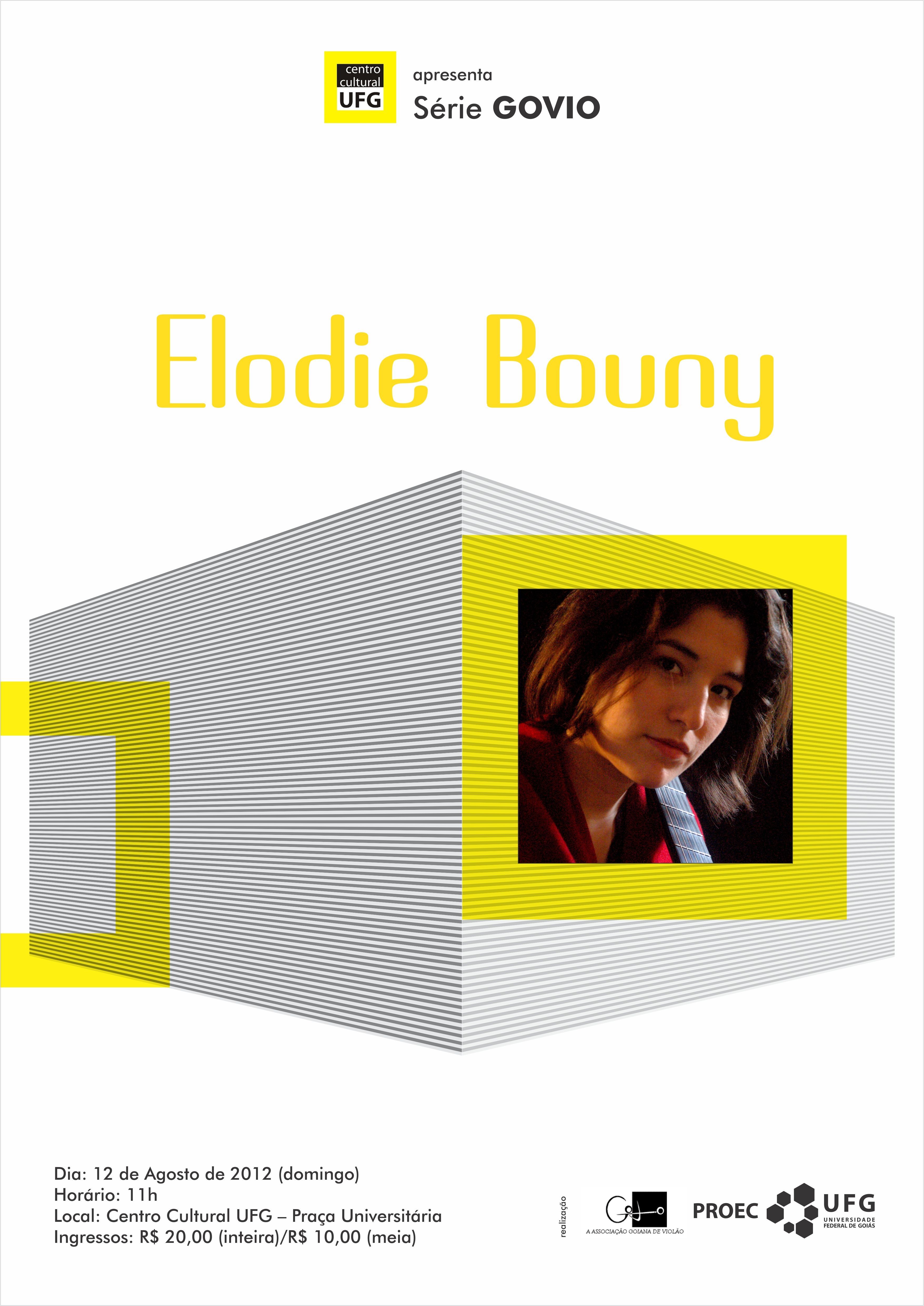 A Série GOVIO, em parceria com a Pró-reitoria de Extensão e Cultura da UFG (Proec-UFG), trazem a Goiânia a premiada violonista francesa Elodie Bouny, que se apresenta no Centro Cultural da UFG no próximo domingo, 12 de agosto, às 11h. Os ingressos custam R$ 20,00, com a meia entrada a R$ 10,00.