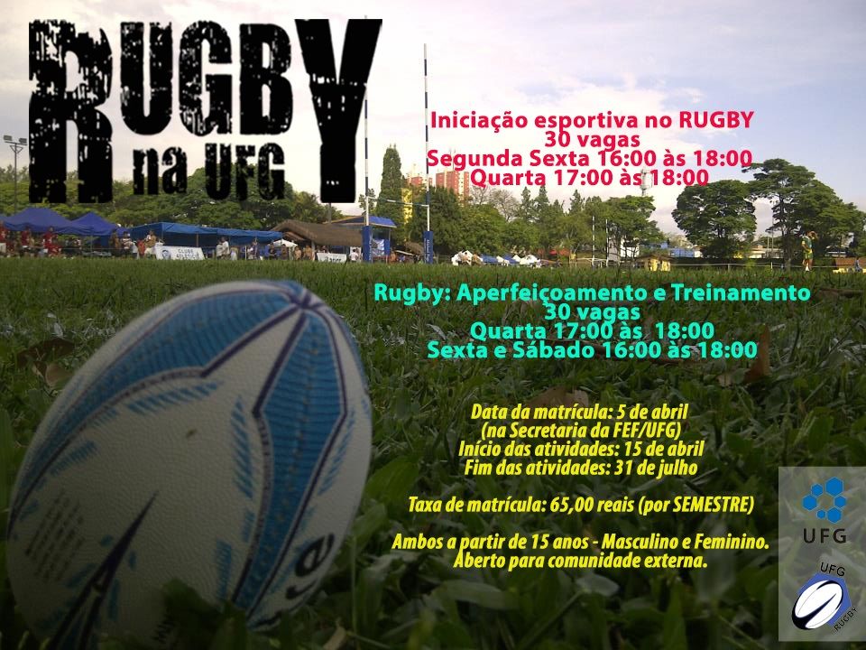 A Faculdade de Educação Física está recebendo matrículas para projetos envolvendo o Rugby. Os projetos focarão em duas dimensões do processo de ensino-aprendizagem do rugby: na iniciação esportiva e no aperfeiçoamento e treinamento desta modalidade. O projeto é aberto a toda a comunidade acadêmica e também a comunidade externa à universidade. As inscrições podem ser feitas no dia 5 de abril, na Secretaria de Extensão da Faculdade de Educação Física UFG, cujo telefone é: (62) 35211085. A taxa é de 65 reais por semestre.