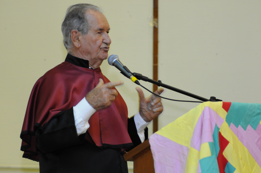 Um rápido discurso e muitos "causos" para o público. Foi assim o pronunciamento do escritor e folclorista Bariani Ortêncio para agradecer "de coração e alma" o título de Doutor Honoris Causa concedido pela Universidade Federal de Goiás. O auditório da Faculdade de Educação ficou lotado de estudantes, professores, autoridades e amigos de Bariani. A sessão especial do Conselho Universitário foi presidida pelo reitor Edward Madureira Brasil.