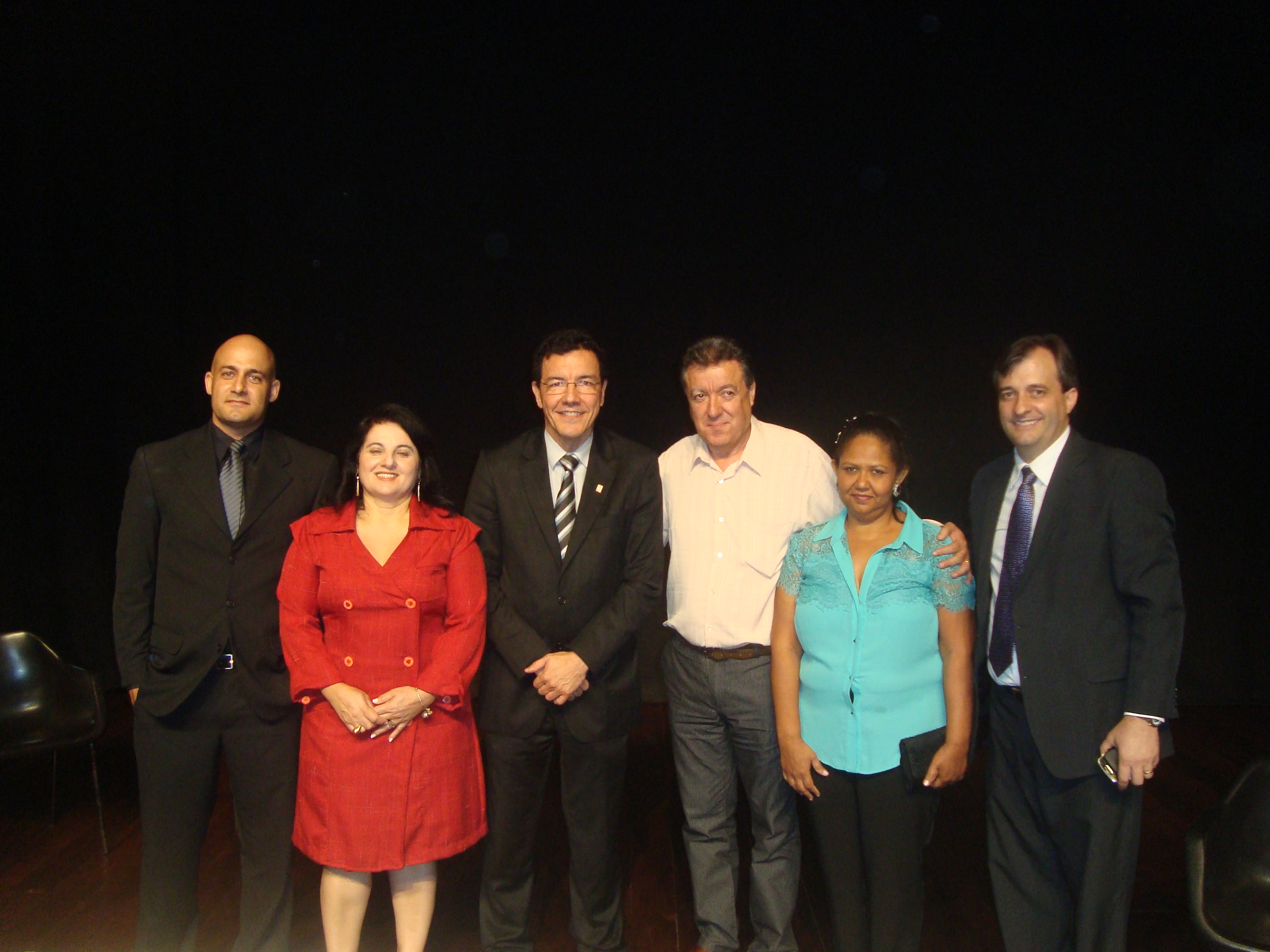 Da esquerda para direita, vice-diretor do Câmpus Cidade de Goiás, Juliano Avelar, a diretora, Maria Meire de Carvalho, reitor da UFG Edward Madureira, ex-diretor do Câmpus Cidade de Goiás, Gonzalo Armijos, representante dos técnico-administrativos, Aparecida Fogaça e vice-reitor da UFG, Eriberto Beviláqua.