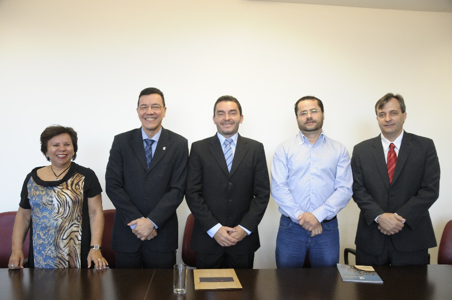 Da esquerda para a direita estão Maria do Amparo Albuquerque, o reitor Edward Madureira Brasil, Moisés Ferreia da Cunha, Mauro Caetano de Souza e o vice-reitor Eriberto Bevilaqua Marin