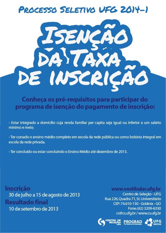 De 30 de julho a 15 de agosto, o Centro de Seleção da UFG recebe pedidos de isenção da taxa de inscrição do Processo Seletivo 2014/1, que será realizado no final do ano. O programa tem como objetivo ampliar a participação de candidatos egressos da rede pública de ensino nas seleções da UFG.