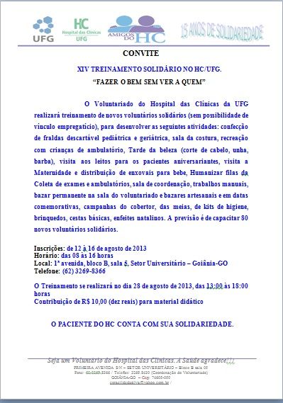 O Voluntariado do Hospital das Clínicas da UFG, em parceria com o Lions Clube de Goiânia Buritis, realizará treinamento de novos voluntários solidários (sem possibilidade de vínculo empregatício), para desenvolver diversas atividades. As inscrições podem ser feitas até o dia 16 de agosto e o treinamento será realizado no dia 28 de agosto, das 13 às 18h. Pede-se a contribuição de 10 reais para despesa de custo com a impressão do material didático.