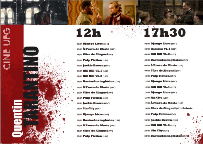 Cine UFG apresenta Tarantino Em 17/09/13 05:52. De 2 a 25 de setembro, o Cine UFG apresenta Mostra Tarantino Para mais informações, acesse o site da Proec. Fonte: Ascom/UFG TweetWhatsApp Listar Todas Voltar