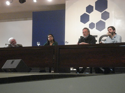 Professor José Carlos Libâneo, professora Ângela Cristina Belém Mascarenhas, conferencista professor Michael Apple e intérprete professor Luiz Armando Gandin