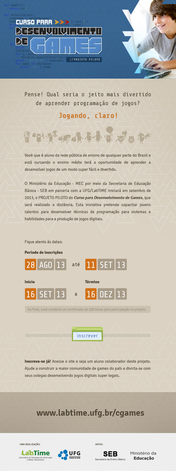 O Ministério da Educação (MEC), por meio da Secretaria de Educação Básica (SEB), em parceria com a UFG/LabTIME, iniciará, em setembro de 2013, o PROJETO PILOTO do Curso para Desenvolvimento de Games. Esta iniciativa pretende capacitar jovens talentos para desenvolver técnicas de programação para sistemas e habilidades para a produção de jogos digitais.