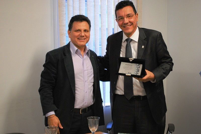 Reitor do IF Goiano, Vicente Pereira de Almeida, entregando homenagem ao reitor da UFG, professor Edward Madureira Brasil