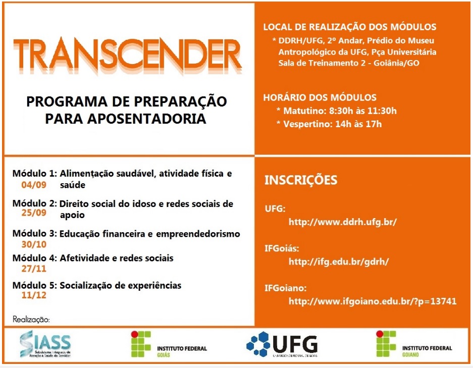 _Transcender: Programa de Preparação para a Aposentadoria_ divulga programação de módulos Em 26/09/13 14:37. Módulos ocorrerão nos turnos matutino e vespertino no prédio do Museu Antropológico da UFG Fonte: Ascom/UFG TweetWhatsApp Listar Todas Voltar