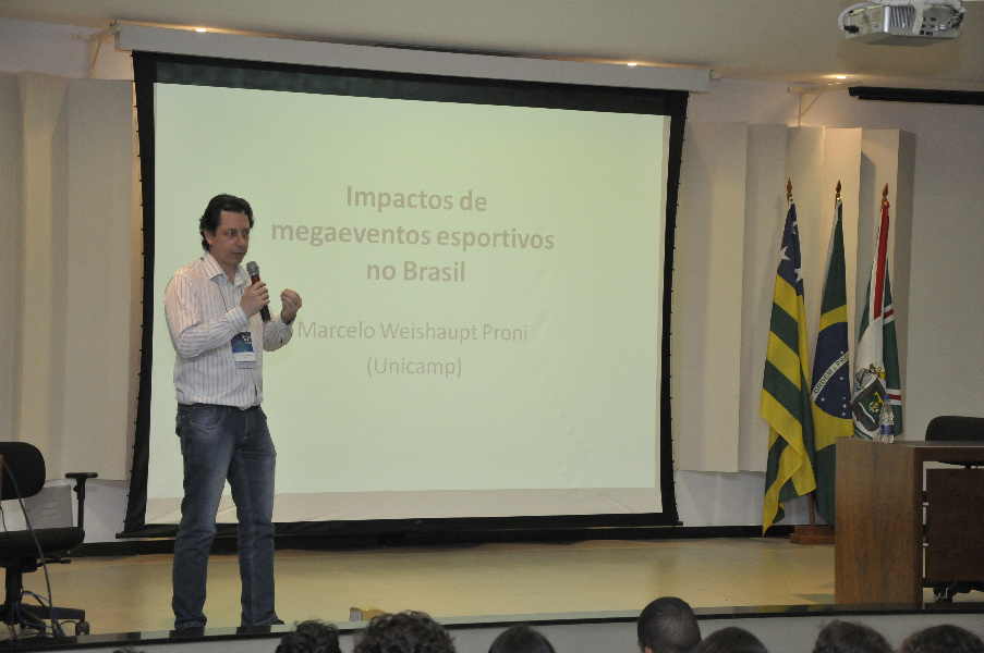 A programação do 10º Conpeex tem chamado a atenção pelos assuntos que são abordados em minicursos, palestras, mesas-redondas e conferências. Na tarde de segunda-feira (14/10), o economista Marcelo Proni, da Unicamp, esteve no auditório da Biblioteca Central para debater um assunto que tem movimentado muitos cidadãos e, principalmente, muito dinheiro: os impactos dos megaeventos esportivos de 2014 e 2016.