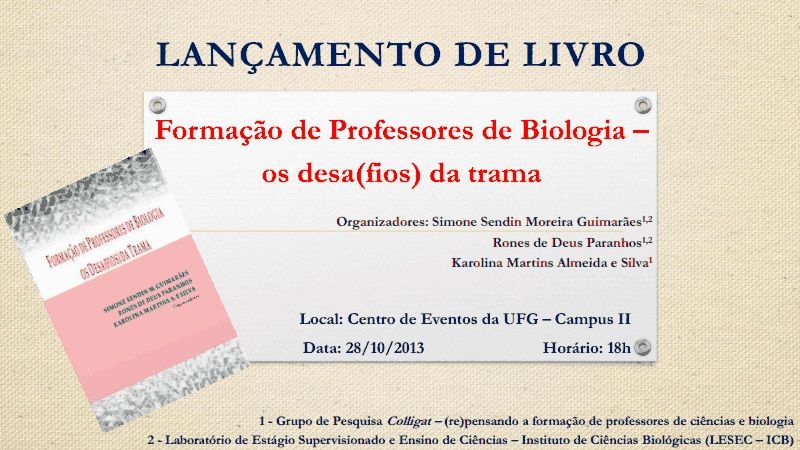 "Formação de Professores de Biologia - os desa(fios) da trama", organizado pelos professores Simone Guimarães, Rones Paranhos e Karolina Silva, será lançado no próximo dia 28/10, às 18 h, no Centro de Cultura e Eventos Professor Ricardo Freua Bufáiçal.