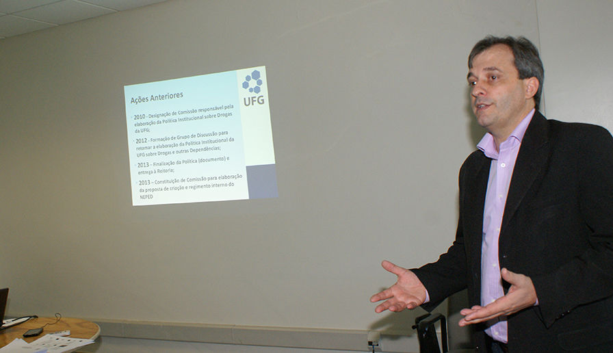 O professor Eriberto Bevilácqua, coordenador da comissão responsável pela elaboração da Política Institucional sobre drogas da UFG, recebeu os convidados. Ele apresentou o histórico de ações que culminaram na proposta de criação do núcleo e salientou o objetivo dessa iniciativa: “Drogas e outras dependências é um assunto muito complexo, de muitas percepções, por isso não pode ser focado por uma única unidade. A ideia do Neped é justamente congregar diversos profissionais de áreas distintas, para dialogarem e solucionarem demandas sobre o assunto”, completou.