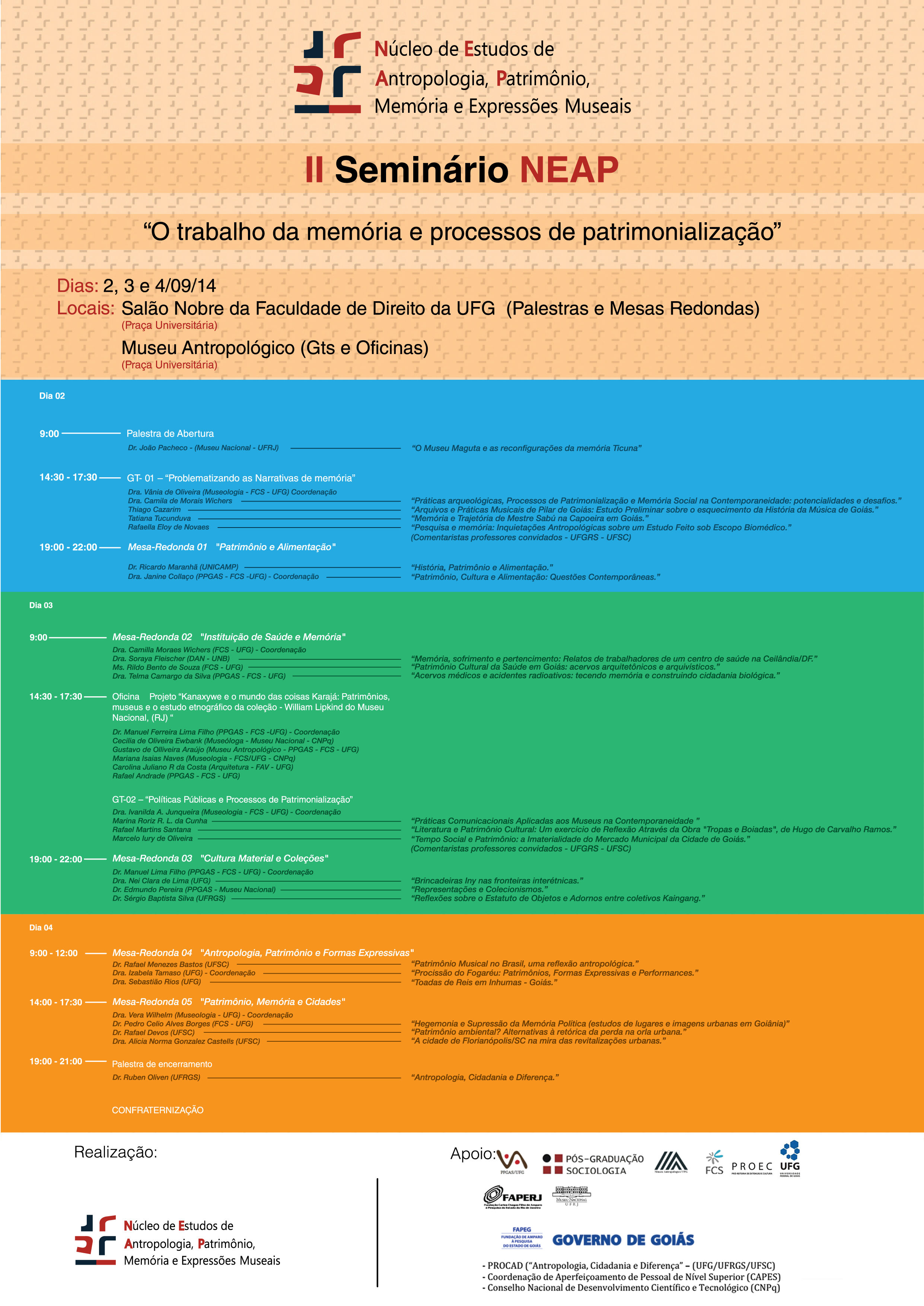 O Neap deste ano apresenta como tema central O trabalho da memória e os processos de patrimonialização. Segundo a professora do Programa de Pós-Graduação em Antropologia Social da UFG, Telma Camargo da Silva, a escolha da temática do seminário foi feita a partir de reflexões sobre os sujeitos e a memória. “A questão principal é a ação dos sujeitos nos processos de transformação simbólica e elaboração dos sentidos do passado”, esclarece a professora.