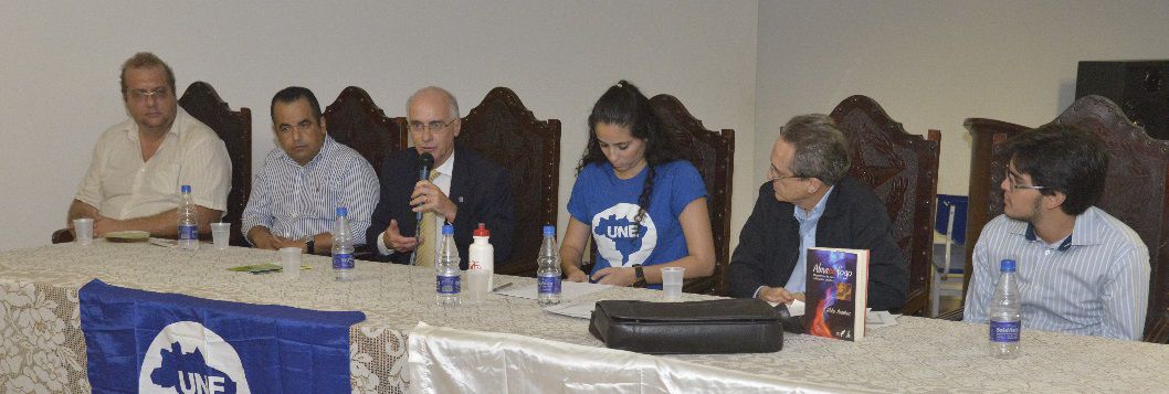 Na mesa que dirigiu o seminário Fernando Mota, representante do Sindicato dos Servidores da UFG (Sint-Ifes GO); Flávio Alves da Silva, presidente da Associação dos Docentes da UFG (Adufg); Orlando Afonso Valle do Amaral, reitor da UFG; Deborah Evellyn, coordenadora geral do Diretório Central dos Estudantes (DCE) e vice-presidente regional da União Nacional dos Estudantes (UNE); Aldo Arantes e Pedro Vargas, presidente do Centro Acadêmico de Direito (Caxim)