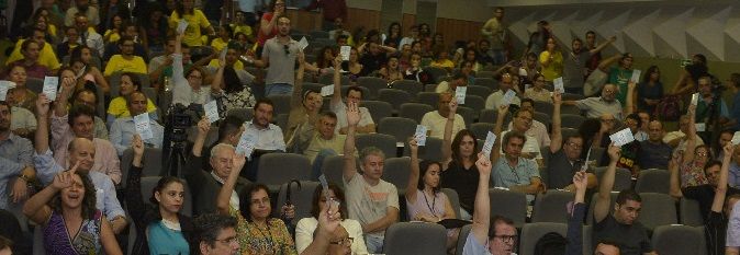O Conselho Universitário (Consuni) da UFG realizou nesta sexta-feira, dia 5 de dezembro, a terceira reunião para discutir a adesão do Hospital das Clínicas (HC) da UFG à Empresa Brasileira de Serviços Hospitalares (Ebserh). Desta vez foi colocada em votação a proposta que foi aprovada por maioria. Houve tumulto e a reunião foi encerrada.