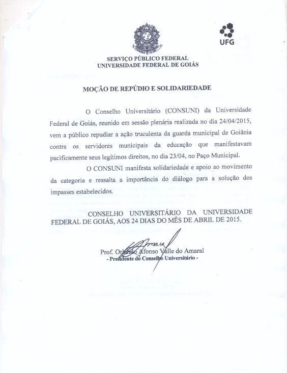 O Conselho Universitário (Consuni) da UFG aprovou em seu última reunião, 24/04, moção de repúdio a ação truculenta da Guarda Municipal de Goiânia contra servidores municipais de educação. O Consuni manifestou ainda solidariedade e aopio ao movimento dos servidores municipais.