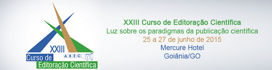 A Associação Brasileira de Editores Científicos - ABEC Brasil, com o apoio da UFG, vai realizar o XXIII Curso de Editoração Científica. O curso será realizado de 25 a 27 de junho, no Centro de Convenções Esmeralda I, do Hotel Mercure. Inscrições seguem até o dia 12/06.