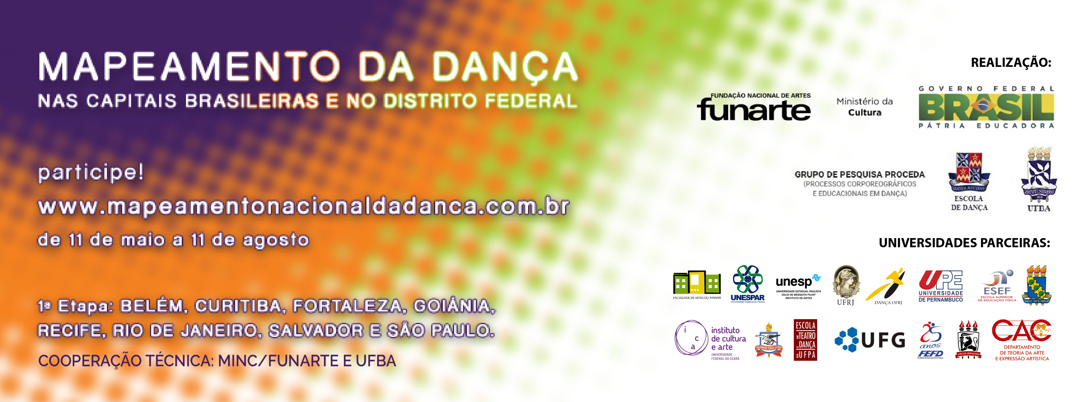 Indivíduos, grupos e instituições que atuem nas áreas de formação e produção artística estão convidados a participarem da pesquisa Mapeamento da dança nas capitais brasileiras e no Distrito Federal, de 11 de maio a 11 de agosto. O projeto é uma iniciativa do Ministério da Cultura (Minc) e visa construir um panorama da dança, abordando aspectos de dimensão social, econômica e artística da área. A primeira etapa do Mapeamento inclui oito capitais do país: Belém, Curitiba, Fortaleza, Goiânia, Recife, Rio de Janeiro, Salvador e São Paulo. Colaboradores podem participar da pesquisa através do site www.mapeamentonacionaldadanca.com.br