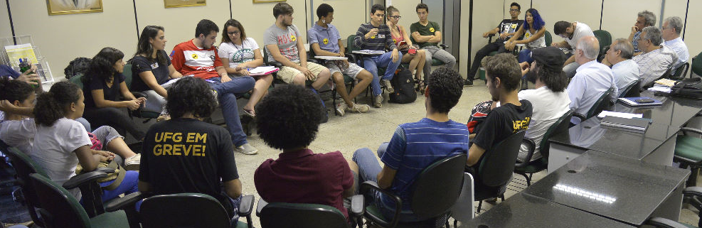 Na tarde desta quarta-feira (03/09) o Reitor da UFG, Orlando Amaral, Vice-reitor, Manoel Chaves, Pró-reitor de Graduação, Luiz Mello, Pró-reitor Assuntos da Comunidade Universitária, Elson Morais e Assessor da Reitoria, Tasso Leite, receberam de representantes do comando de greve dos estudantes a pauta de reivindicações do movimento. Segundo os integrantes do comando de greve dos estudantes, tais demandadas foram construídas em assembleia, com representantes de todas as regionais da Universidade, com pautas gerais e específicas.