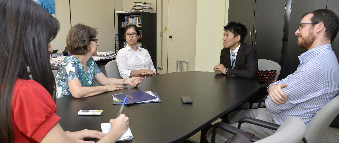 Em reunião na Coordenadoria de Assuntos Internacionais (CAI) da UFG, nesta quinta-feira, 03/9, Shuichiro Masukata, da Kanda University of International Studies, se reuniu com a coordenadora, Ofir Bergemann, e os professores do curso de Relações Internacionais Carlo Patti e Aline Martins, para discutirem uma possível parceria entre a universidade japonesa e a UFG no intercâmbio de estudantes e pesquisadores.