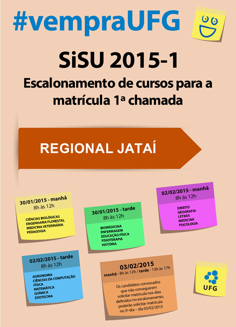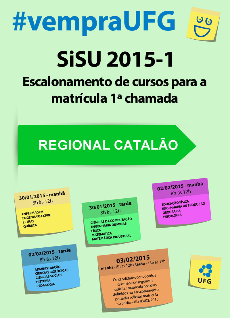 O período de matrículas tem início nesta sexta-feira, 22, com a divisão dos cursos por datas. Os candidatos selecionados para as vagas da primeira chamada do SiSU deverão fazer o pré-cadastro no site www.sisu.ufg.br e realizar a matricula nos dias 22, 25 e 26 de janeiro. Com a realização das matrículas nas Regionais Catalão, Goiânia, Goiás e Jataí dividida por cursos, o atendimento aos classificados ocorrerá entre 8h às 12h e das 13h às 17h. Mais informações no Portal UFG.