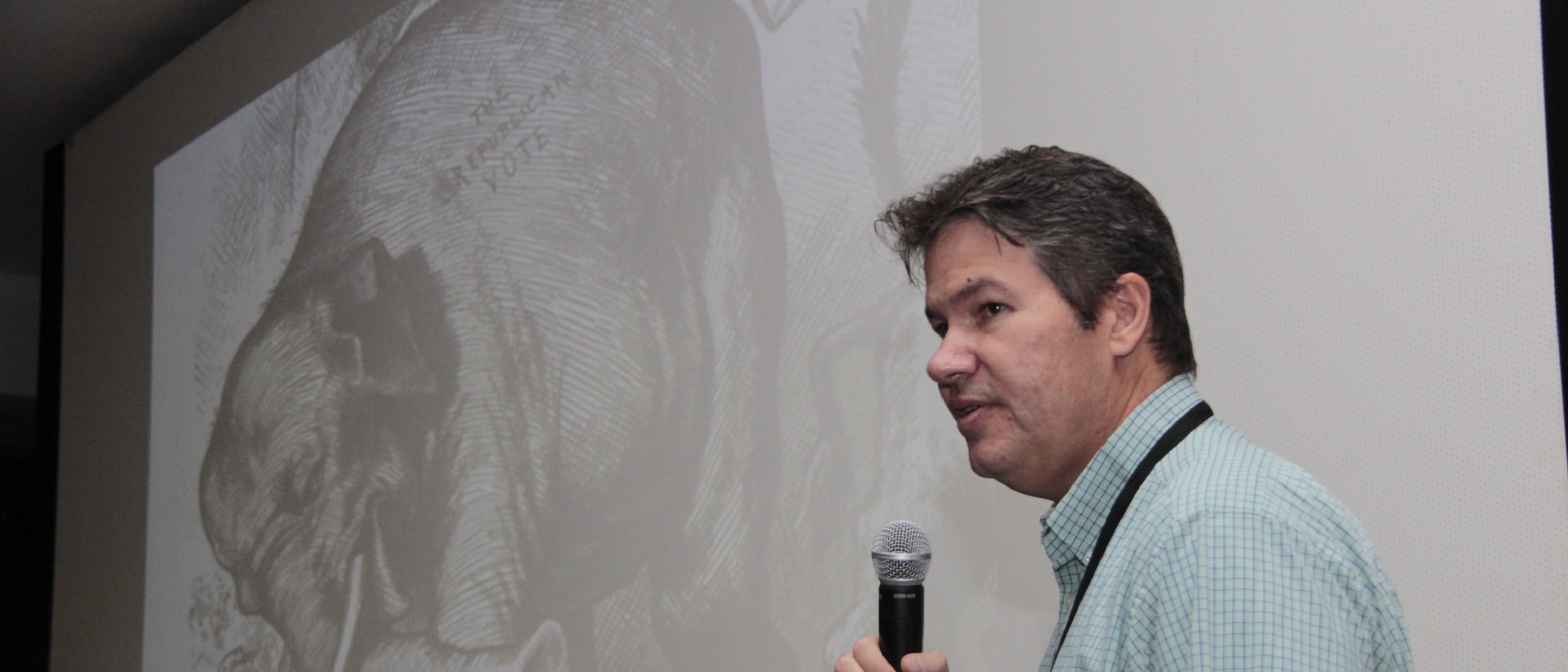 O cartunista político norte-americano Rick McKee, de um dos jornais mais antigos dos Estados Unidos, o The Augusta Chronicle, palestrou na manhã desta sexta-feira (21/10) no Cine UFG, localizado na Faculdade de Letras, no Câmpus Samambaia. O encontro foi uma parceria da Embaixada dos Estados Unidos da América com a Universidade Federal de Goiás (UFG) e teve o apoio da Faculdade de Informação e Comunicação (FIC) e da Coordenadoria de Assuntos Internacionais (CAI).