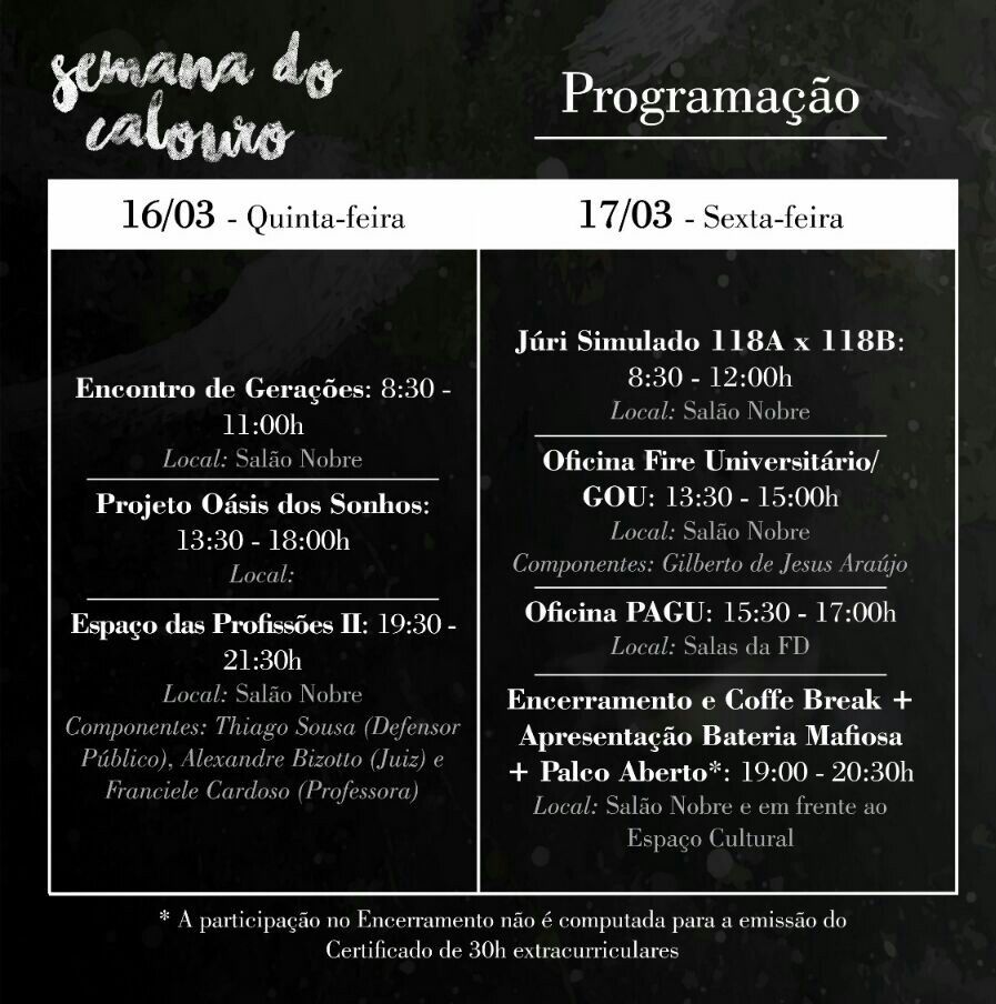 Na programação também constaram palestras com professores e pesquisadores de outras instituições de ensino superior, apresentação e realização de oficinas com os grupos de pesquisa e extensão da FD e palestras com profissionais das diversas áreas de atuação para o profissional graduado em Direito, tais como juiz, promotor, delegado, professor e advogado.