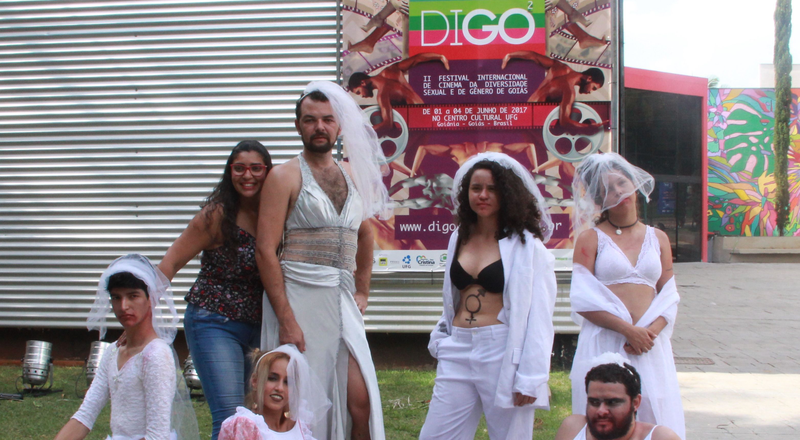 No início da tarde desta quinta-feira (1/6), quem passou pela Praça Universitária se deparou com uma procissão. Trajados com vestidos de noiva ou trazendo pinturas pelo corpo, artistas participantes do II Festival Internacional da Diversidade Sexual e de Gênero de Goiás (Digo) romperam com o cotidiano automatizado da cidade, desviando a atenção e sentindo os olhares do público com a intervenção urbana Eu te Aceito. A caminhada foi encerrada com apresentação performática que explorou as práticas de afeto e amores desviados.